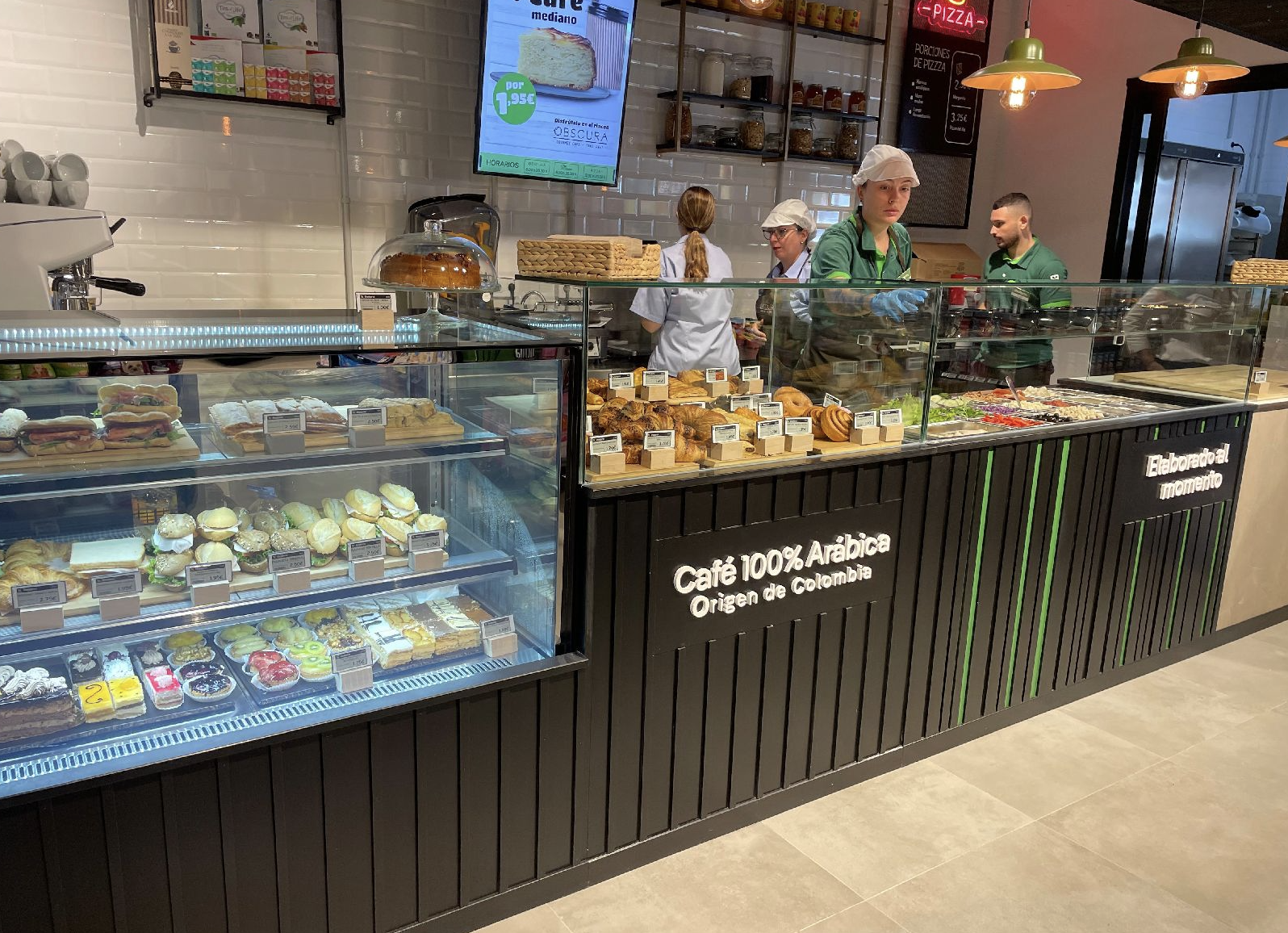 Para la exposición de producto de seco se han utilizado estanterías en color corporativo para góndolas y murales con todos los accesorios necesarios, muebles de caja con soportes para todo el equipo informático y la fabricación del mural de panadería siguiendo la imagen corporativa de Dialprix Tenerife.